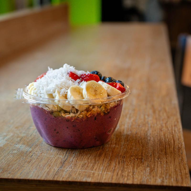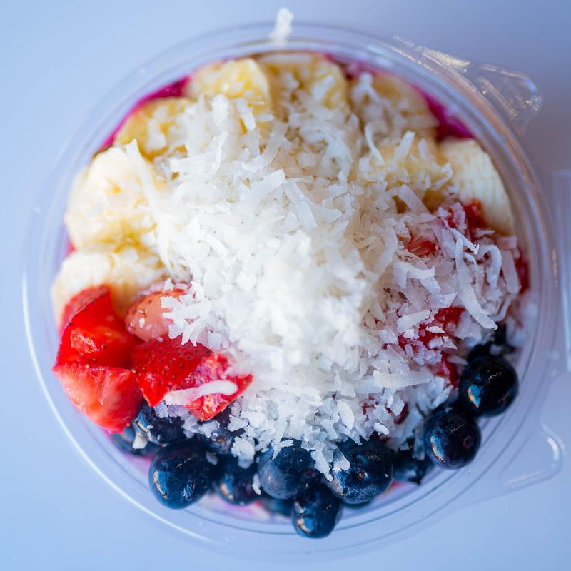 Acai, soy milk, strawberries, blueberries, bananas, topped: Nut Free Granola, Fresh Banana, Strawberry, Blueberry, Coconut and Honey.