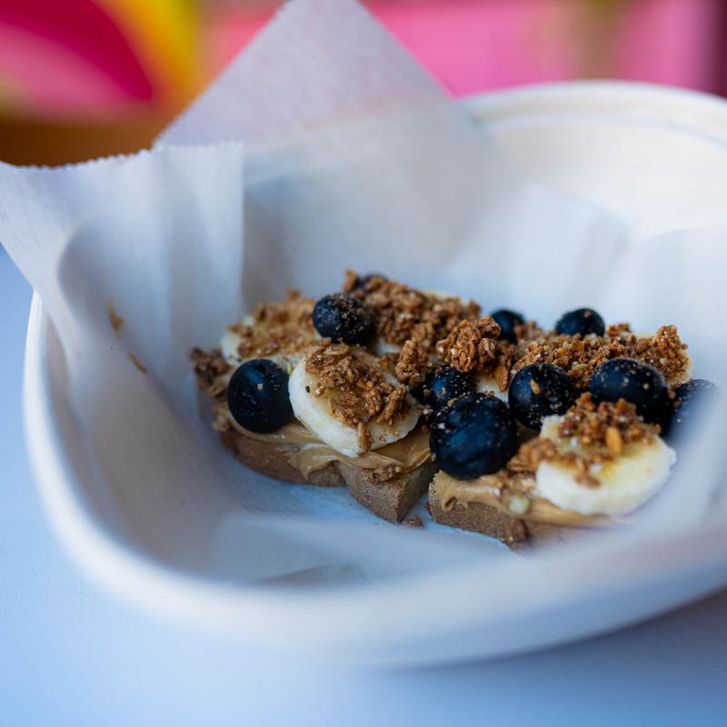 Creamy peanut butter, banana slices and blueberries, sprinkled with nut-free granola on toasted schar sourdough bread.