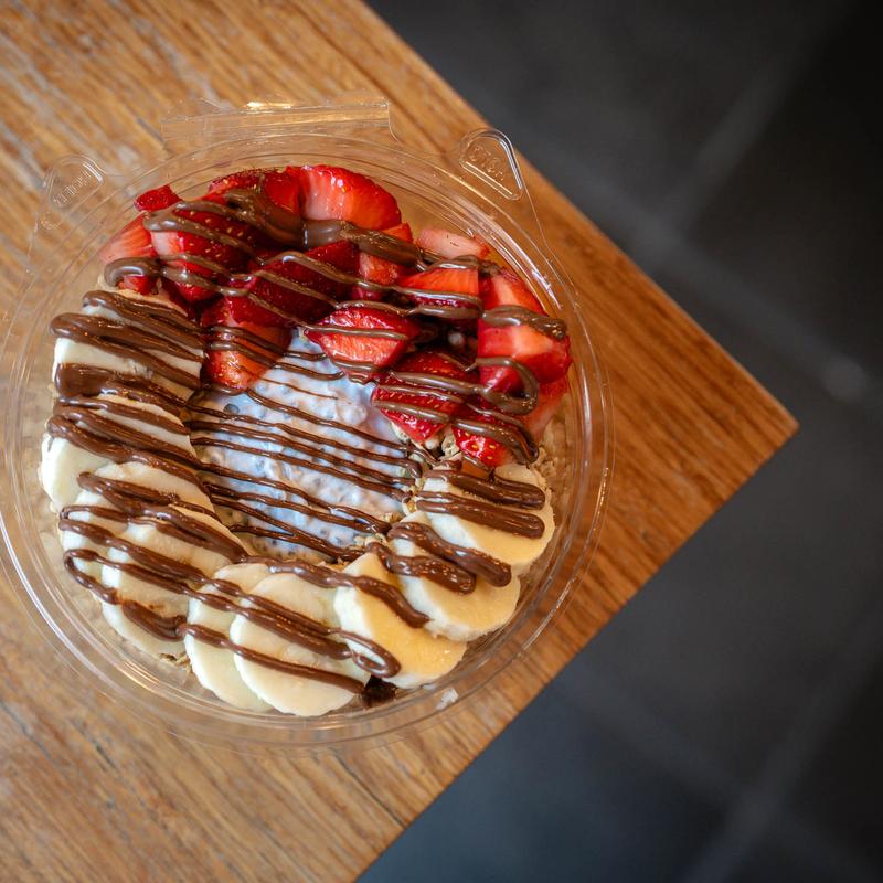 Acai, Soy Milk, Nutella, Strawberries, Banana Topped: Nut-free granola, fresh banana, strawberries, Nutella, chocolate chips.